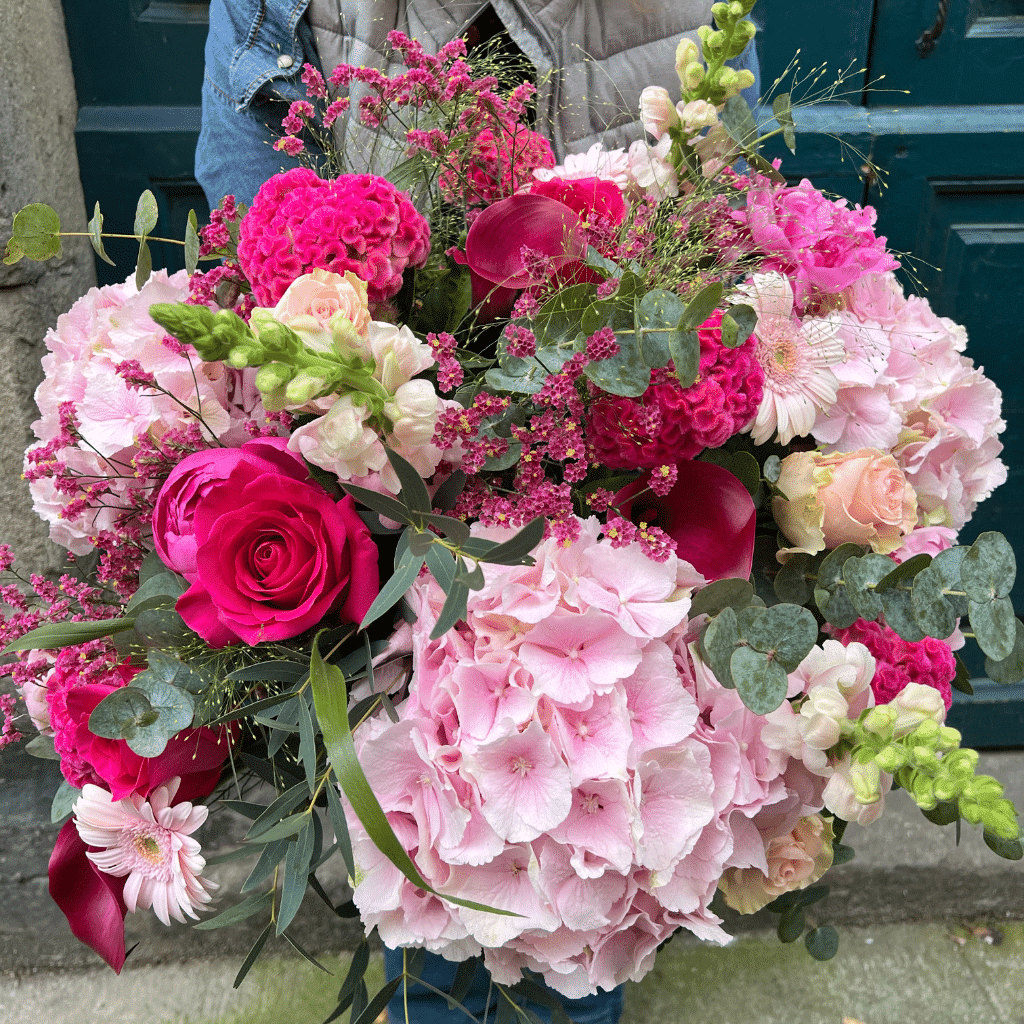 Magnifique bouquet composé d’hortensias, roses, pivoines et autres fleurs pour agrémenter.
