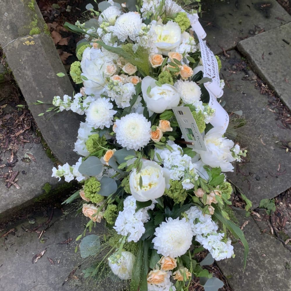 Cette pièce est réalisée avec des fleurs fraîches de saison dans les couleurs choisies par le client. La raquette mesure en général au minimum 60 cm de long et peut être agrémentée de rubans personnalisés ou d’autres ornements selon les souhaits du client. Estel Fleurs vous propose des raquettes sur mesure pour rendre hommage à vos proches disparus.